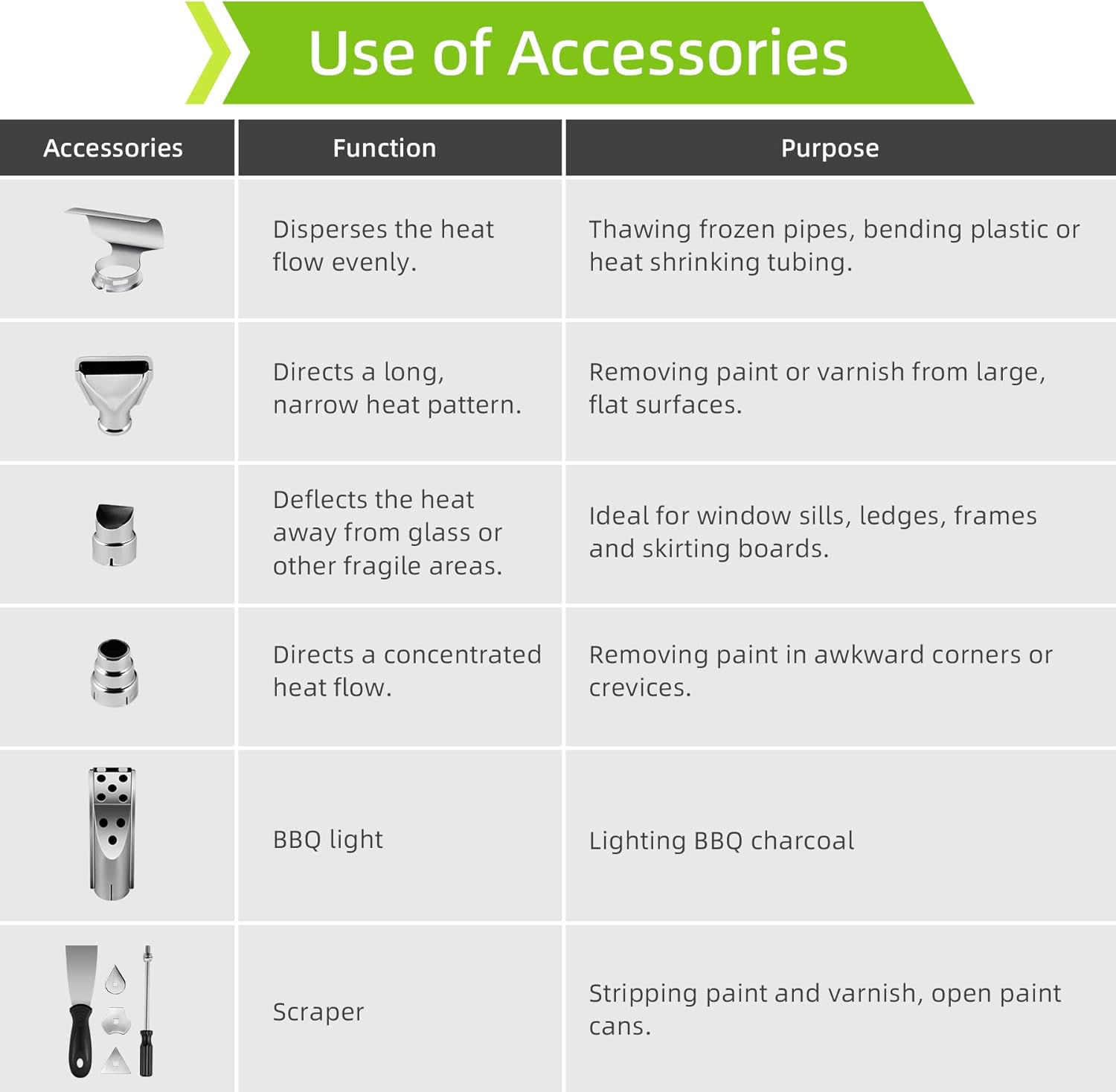 10 Attachments & Widely Application:6.6FT UL cord, 5 different nozzles and 1 set of paint removal equipment make this hot air gun ideal for crafts, removing paint, epoxy resin, shrinking tube/wrap, heating PVC, vinyl wrap, and other heating projects.