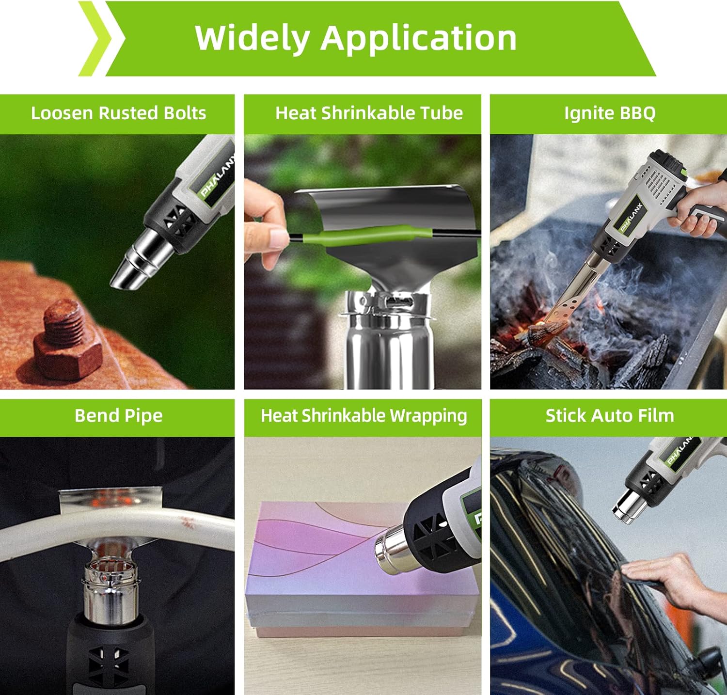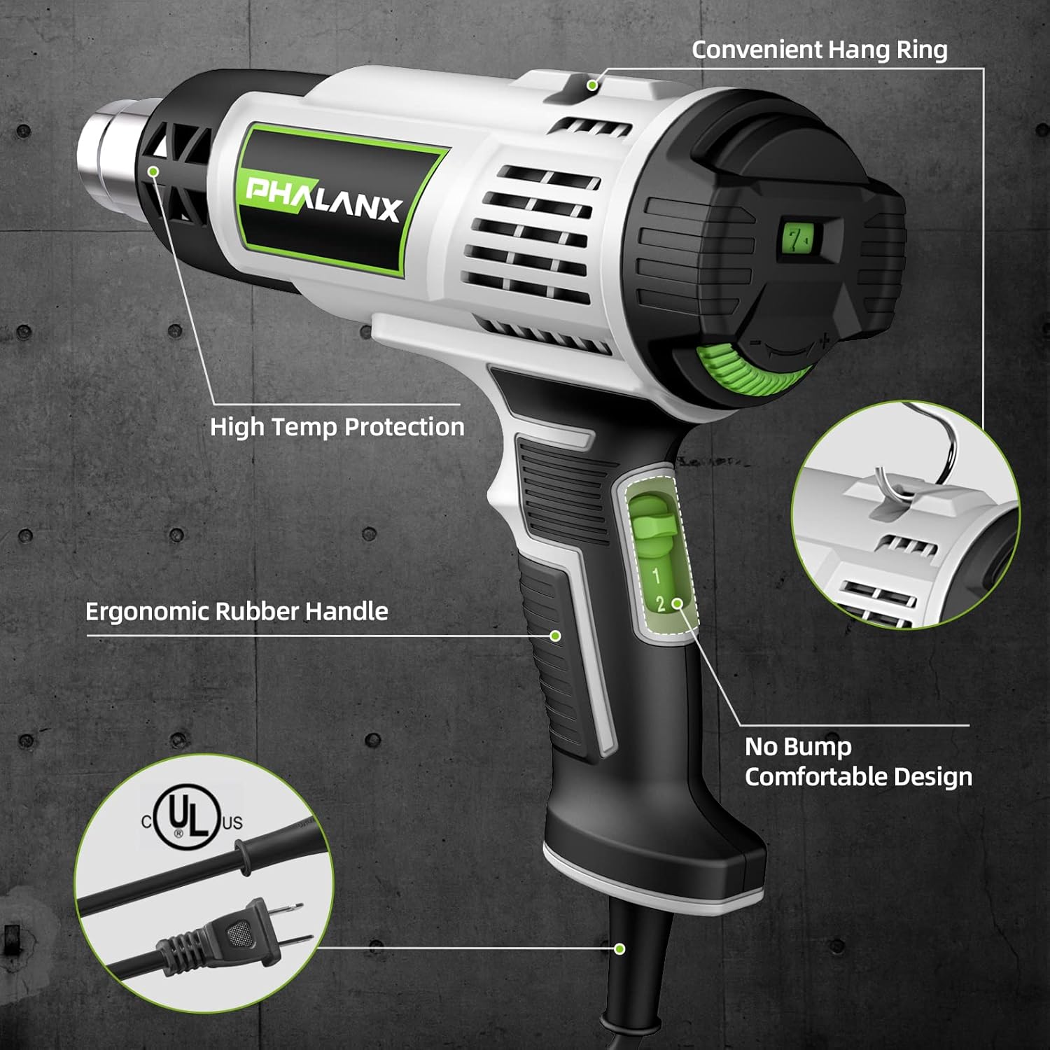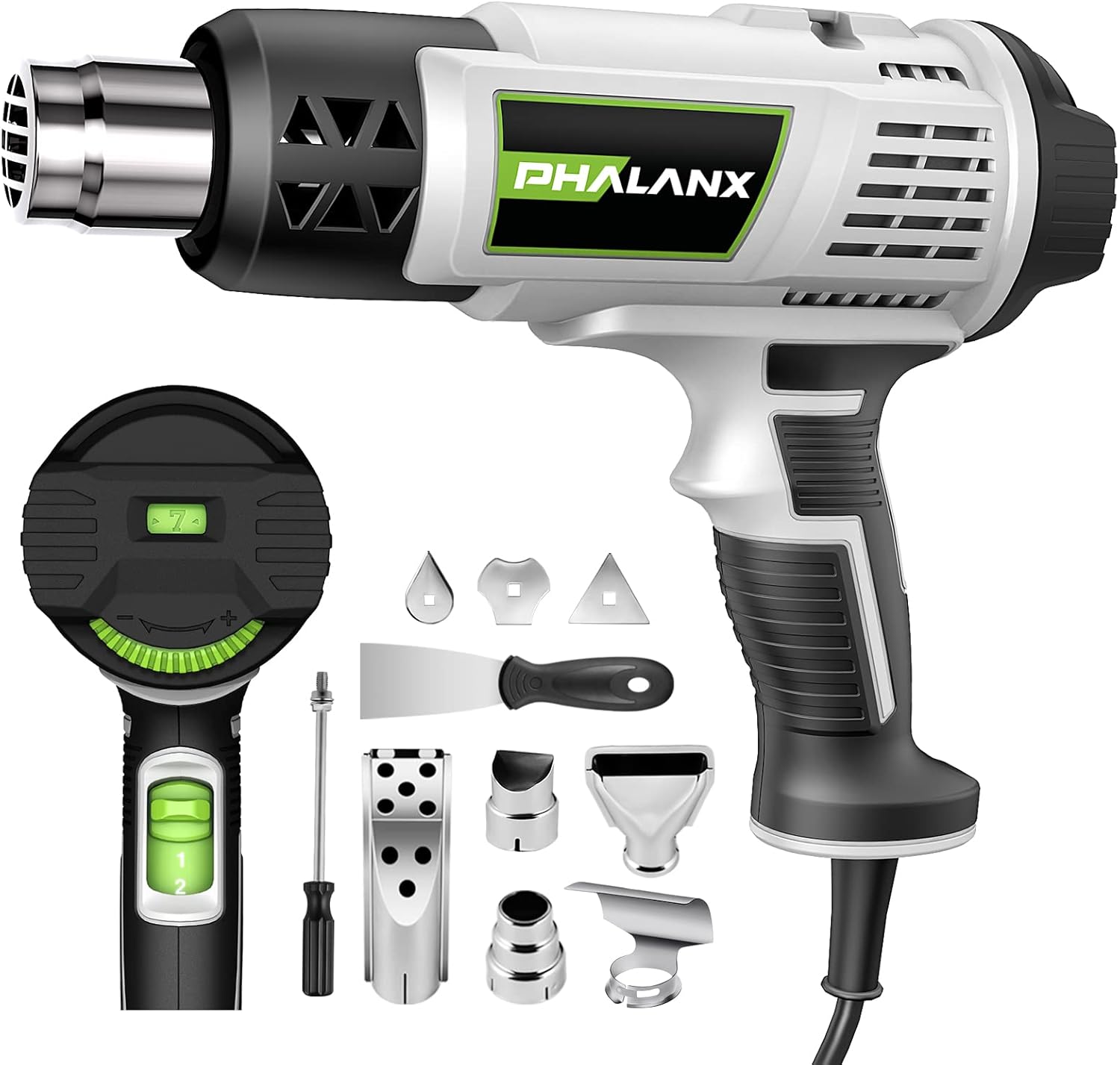 Strong Power & Overheat Protection:PHALANX 1500W/120V fast heating heat gun kit has 2 temperature settings, I:122℉-752℉ 300L/min, II:194℉-1202℉ 500L/min and 7 temperature grades. The overheat protection system effectively avoids the damage of machine or electronic circuit.