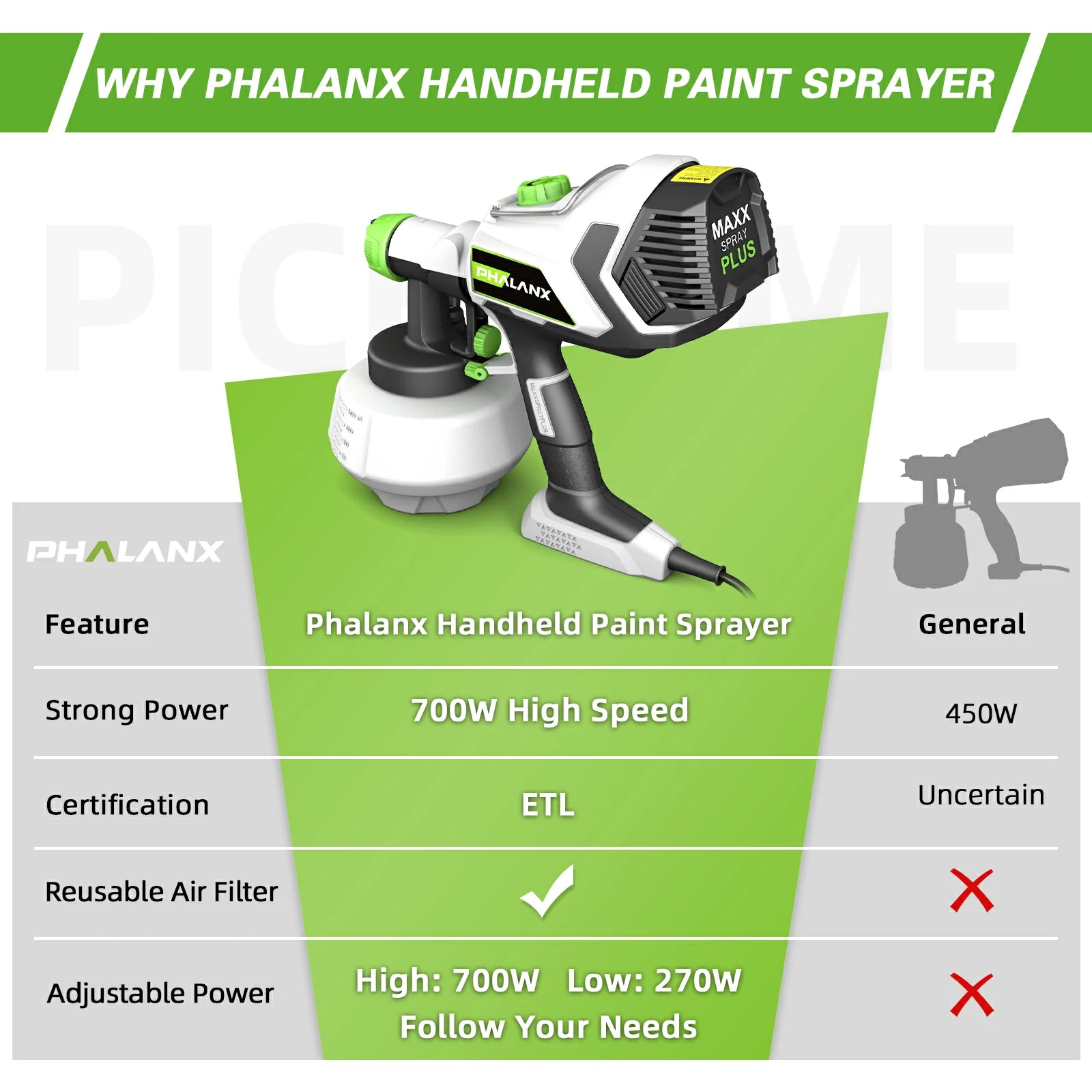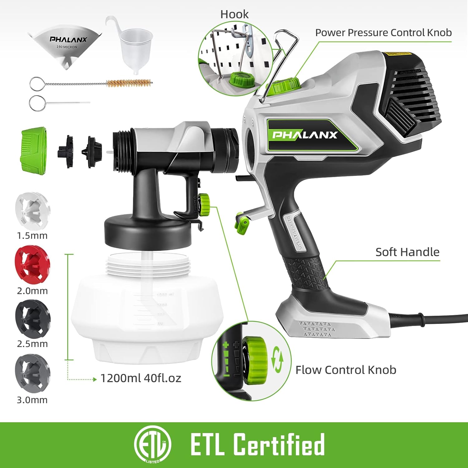 The Phalanx HVLP Electric Paint Sprayer is ETL certified and features double insulation. It is easy to assemble and operate, with a 1200ml capacity that makes it ideal for home DIY projects while effortlessly achieving a Class A finish.