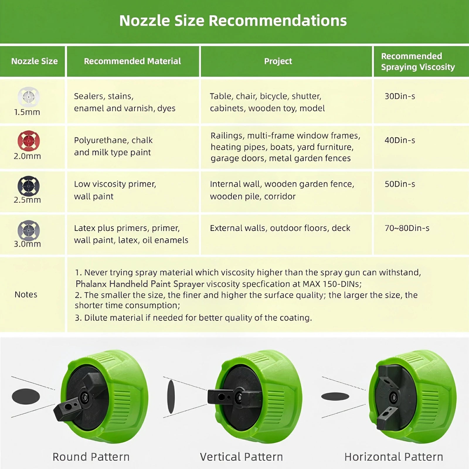 Suitable for chalk-type paint, latex paint, varnish, milk paint, porcelain paint, primer, clear sealer, polyurethane, varnish and colorants. It comes with 4 nozzles (1.5/2.0/2.5/3.0mm) with adjustable flow control and 3 patterns with 6.6FT cord for precise output and material savings. Ideal paint sprayer for furniture, fences, walls.
